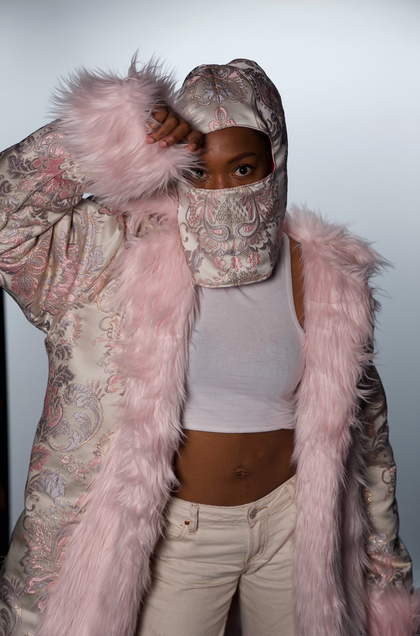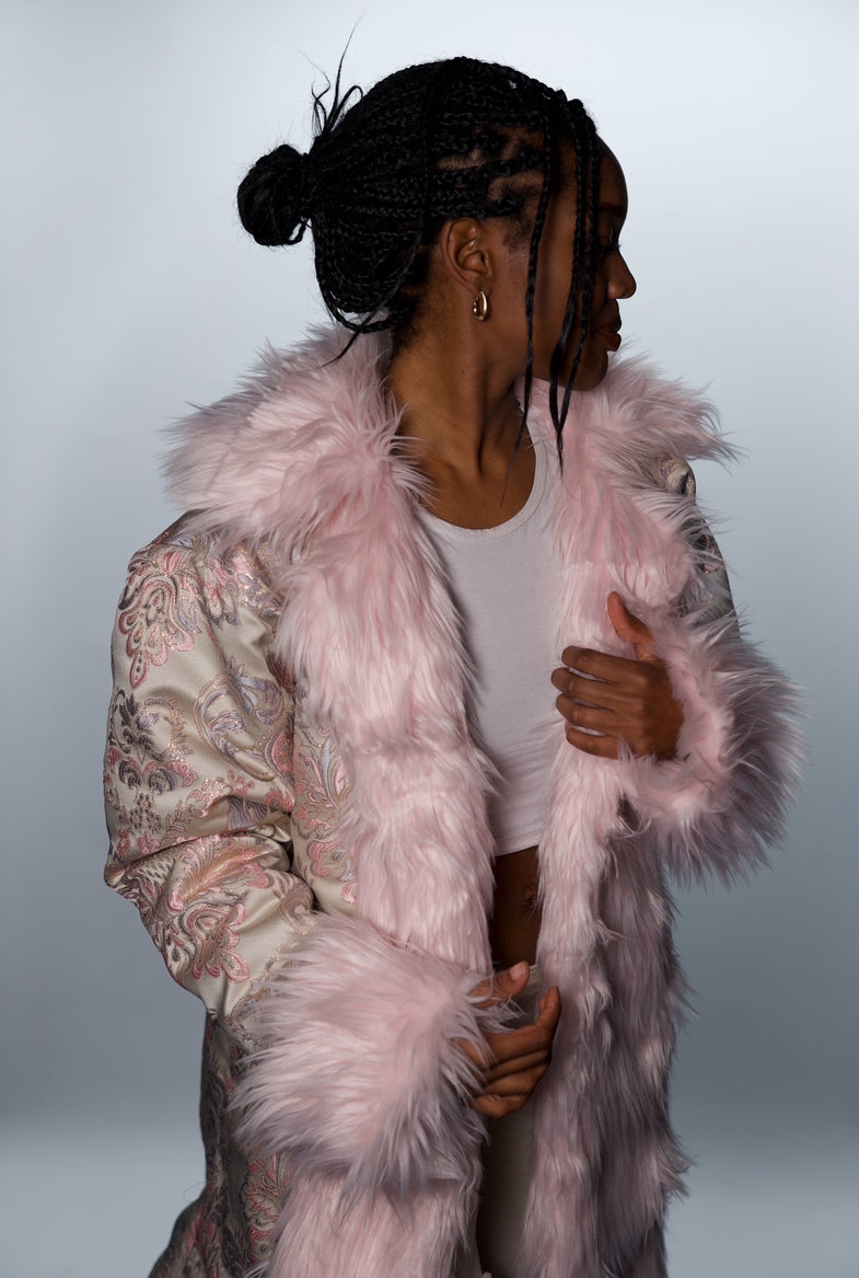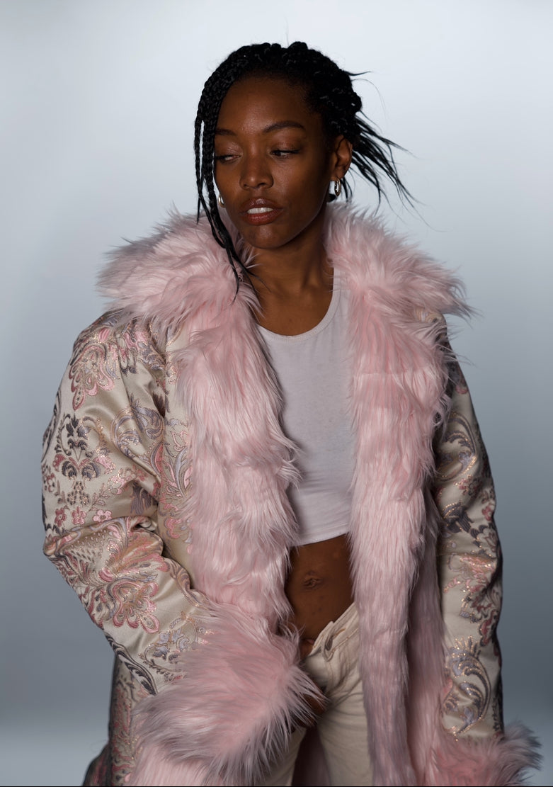 Pink faux fur coat with ivory/pink satin brocade lining. Contains hidden zipper pocket for valuables.