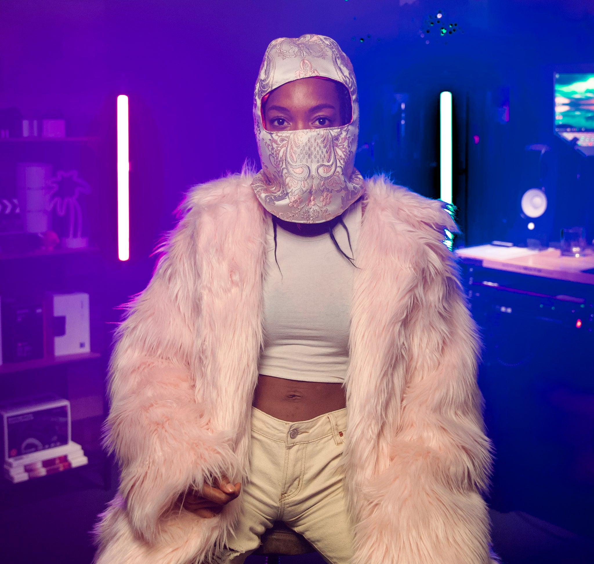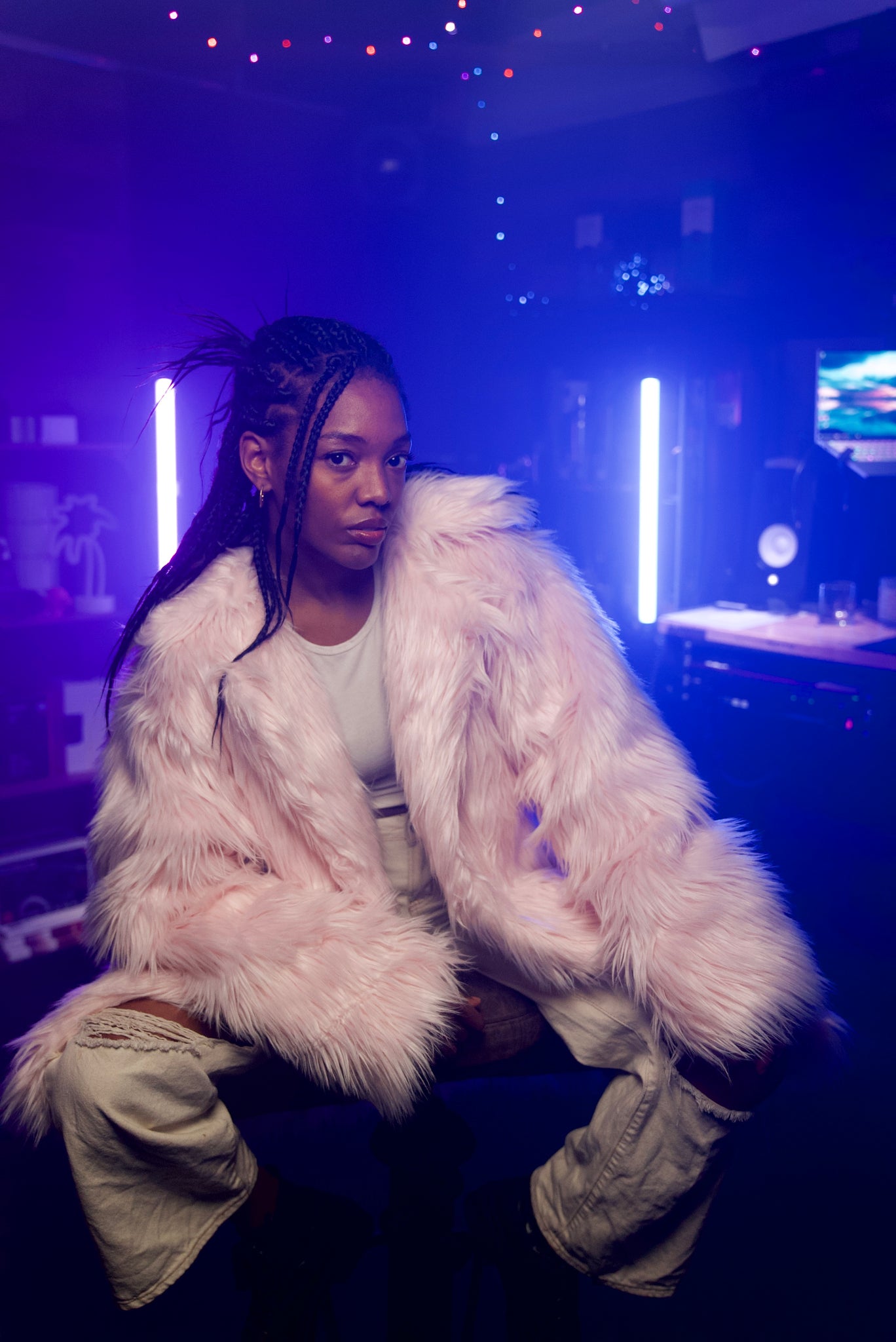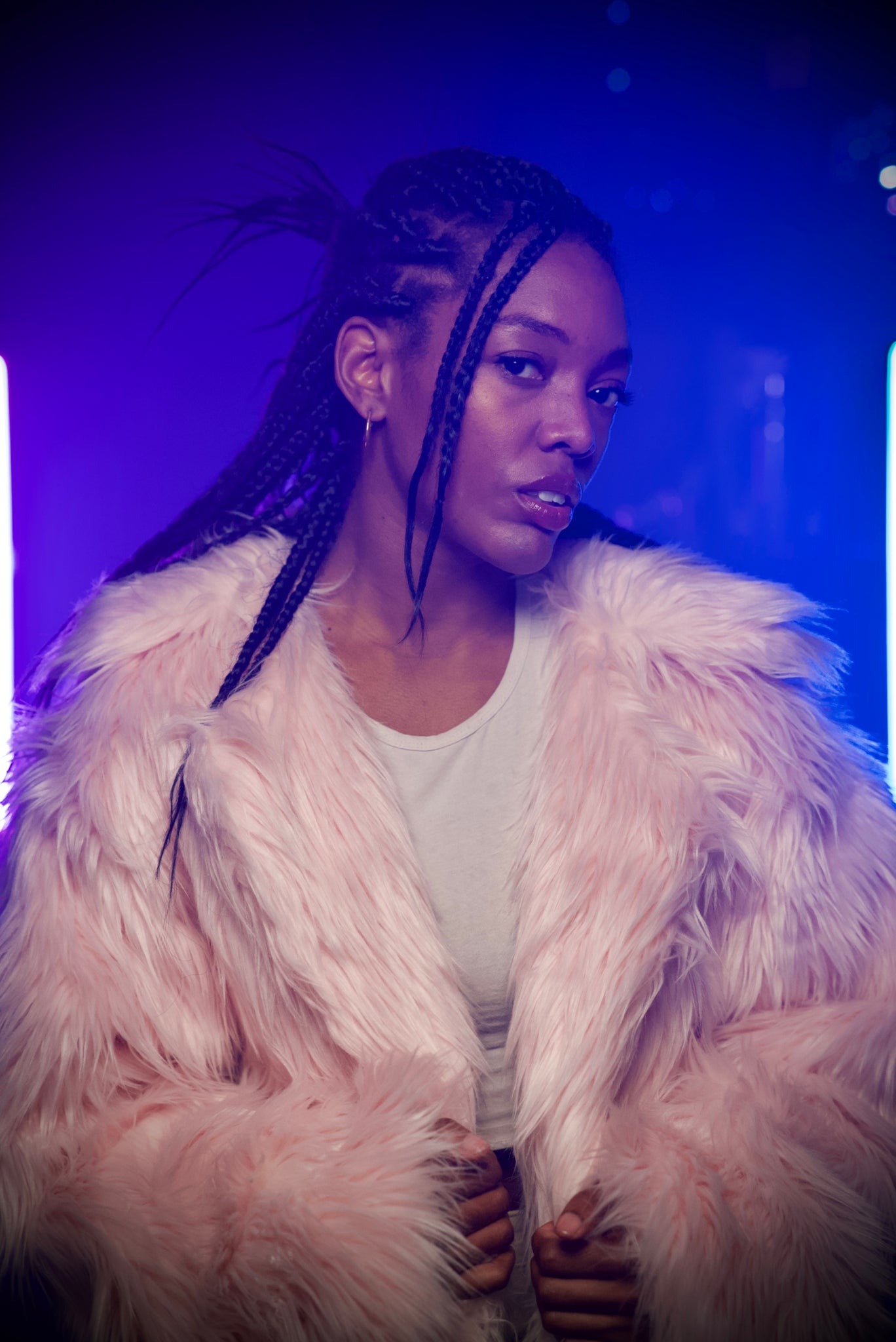 Pink faux fur coat with ivory/pink satin brocade lining. Contains hidden zipper pocket for valuables.